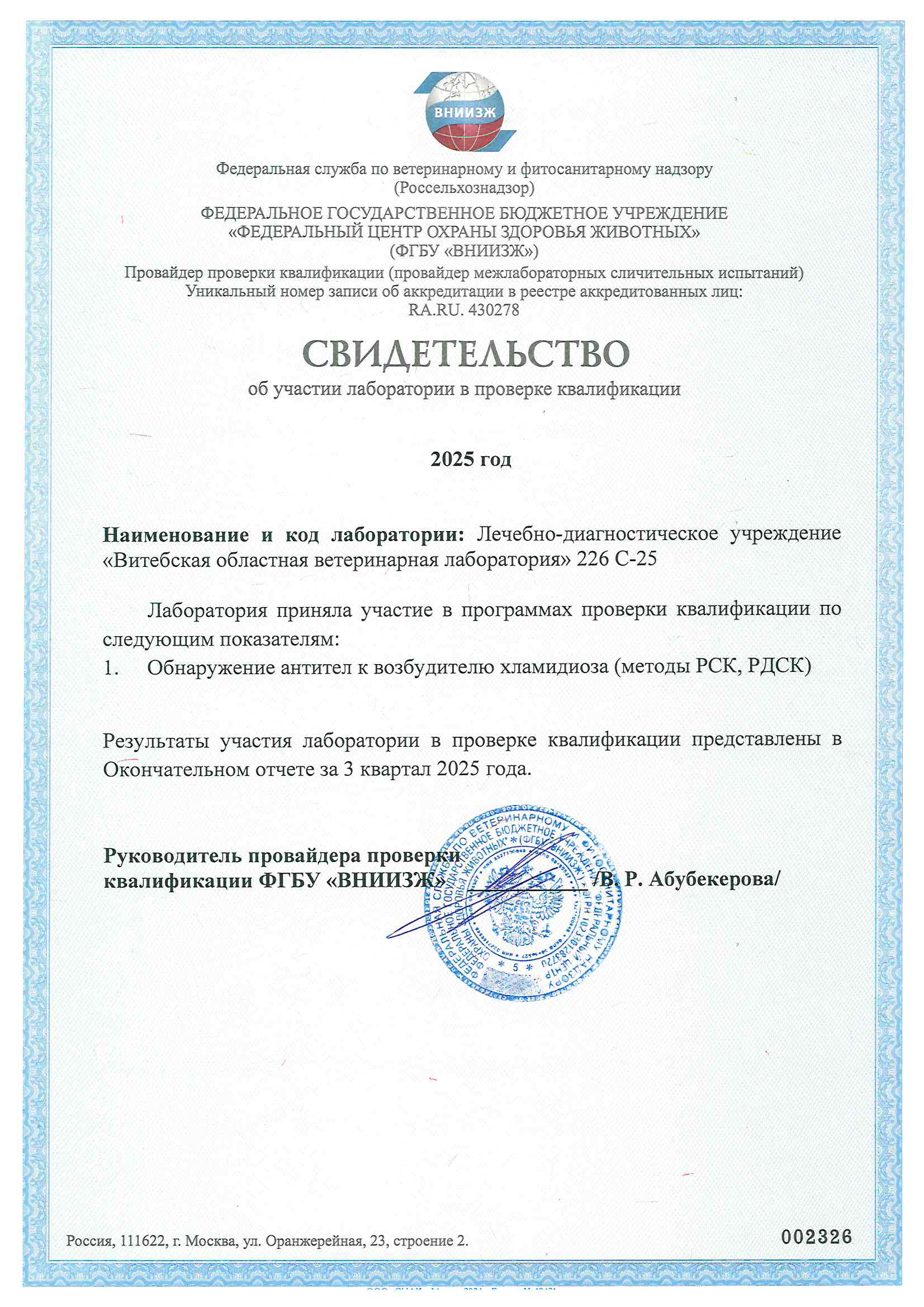 В третьем квартале 2025 года отдел серологии принял участие в проверке квалификации по программе 250 С/1-25 «Обнаружение антител к возбудителю хламидиоза (методы РСК, РДСК)». Провайдер проверки квалификации - Федеральное государственное бюджетное учреждение «Федеральный центр охраны здоровья животных» («ФГБУ «ВНИИЗЖ»).